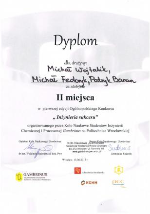 Studenci z naszego Koła odnieśli sukcesy w finale pierwszej edycji ogólnopolskiego konkursu wiedzy o Inżynierii Chemicznej i Procesowej „Inżyniera Sukcesu” organizowanego przez Koło Naukowe „Gambrinus” z Politechniki Wrocławskiej. Finał konkursu odbył się 13 czerwca 2015 roku na Wydziale Chemicznym Politechniki Wrocławskiej.