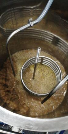 Brzeczkę doprowadza się do wrzenia i w określonych momentach dodaje się do niej chmiel (zależnie od tego, czy chcemy uzyskać piwo bardziej goryczkowe, czy aromatyczne). Po warzeniu, za pomocą stalowej chłodnicy zanurzeniowej roztwór jest szybko chłodzony do temperatury fermentacji. Aby napowietrzyć brzeczkę przed fermentacją, pod koniec schłodzenia zwiększa się jej przepływ za pomocą zaworu.