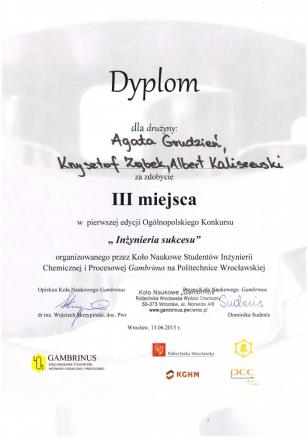 Studenci z naszego Koła odnieśli sukcesy w finale pierwszej edycji ogólnopolskiego konkursu wiedzy o Inżynierii Chemicznej i Procesowej „Inżyniera Sukcesu” organizowanego przez Koło Naukowe „Gambrinus” z Politechniki Wrocławskiej. Finał konkursu odbył się 13 czerwca 2015 roku na Wydziale Chemicznym Politechniki Wrocławskiej.