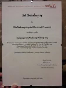 Z radością informujemy, że nasze Koło zostało wyróżnione przez SSPW – Samorząd Studentów Politechniki Warszawskiej tytułem „Najlepszego Koła Naukowego Kadencji 2015”.